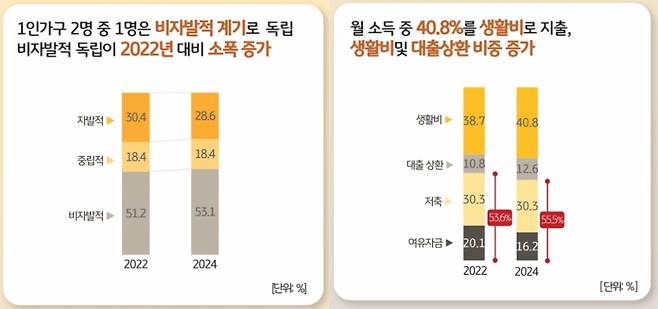 반면 1인 생활을 지속하겠다고 답한 응답률은 55.8%로 지난 조사(2022년 56.3%)보다 감소했다. 고물가·고금리로 인해 생활비와 거주비 부담이 늘었기 때문으로 추정된다.