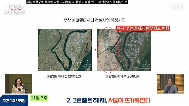 ◆ 홍종호> 일반적인 경제 방송에서 부동산 관련은 초미의 관심사니까 이미 많이 다루고 있을 거고 저희는 기후 관점에서 그린벨트의 긍정적인 효과와 같은 관점에서 봐야 합니다. 어쨌든 서울의 그린벨트 해제는 이명박 정부 이후 12년 만이다라는 얘기가 있어요.