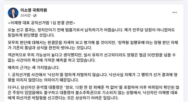 이 의원은 "심지어 국민의힘 법조 의원들도 100만 원 이하 벌금을 예측했다고 하는데, 재판부가 어떤 이유로 이렇게 상식과 통념을 파괴하는 양형을 선고한 것인지 이해가 되지 않는다"며 "아직 1심 판결이고, 통상적이지 않은 판단인만큼 상급심에서 바로잡을 가능성이 얼마든지 있다고 생각한다. 의연하고 당당하게 2심 판결을 지켜보자"고 당부했다.