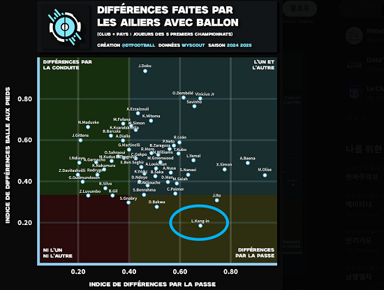 사비 시몬스(라이프치히), 이토 준야(스타드 랭스)에 이어 이강인은 비니시우스 주니오르(레알 마드리드)와 비슷한 위치에 있었다. 볼 컨트롤이 낮아 그래프 하단에 위치했으나 패스 부분에서는 유럽 5대리그에서 다섯 손가락 안에 들 정도로 탁월한 능력을 발휘한다는 뜻이었다.