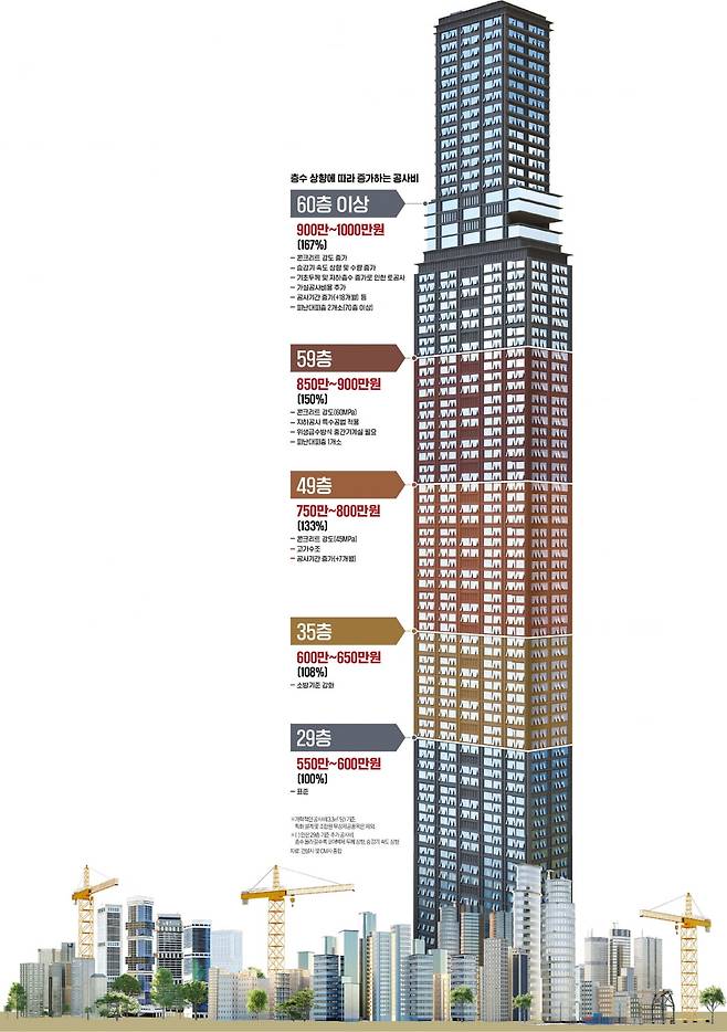 건설업계에 따르면 표준 아파트 ‘29층’까지는 3.3㎡당 공사비가 대략 550만~600만원이 든다. 소방법상 규제가 적용되는 준초고층이 30층부터란 점을 고려한 계산이다.