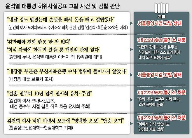 더불어민주당은 김건희 여사의 도이치모터스 주가조작 의혹을 부인하며 “네 달 정도 맡겼는데 손실을 봐서 돈을 빼고 절연했다”는 윤 대통령의 2021년 10월15일 국민의힘 대선 경선 토론회 발언 등을 서울중앙지검에 허위사실공표 혐의로 고발한 상태다. 2019년 7월 윤석열 검찰총장 인사청문회 당시 자유한국당(현 국민의힘)에서 의혹을 제기한 뒤 검찰 수사가 진행되는 상황이었기 때문에 ‘손실만 봤다’는 발언은 사전에 준비된 성격이 짙다. 이후 김건희·최은순 모녀가 도이치모터스 주식 투자로 23억원의 차익을 얻은 사실이 검찰 수사로 드러났다.