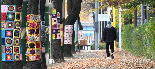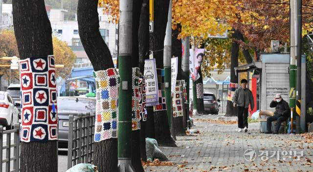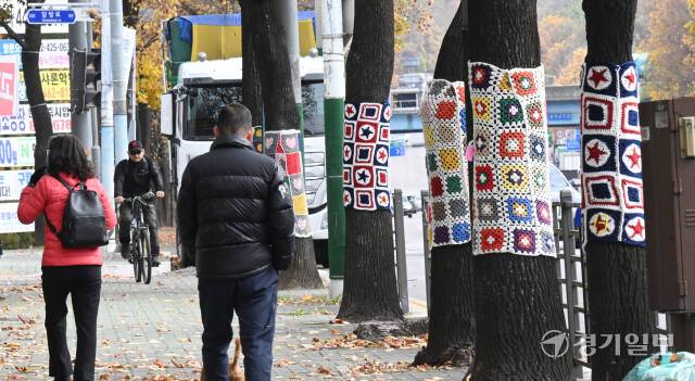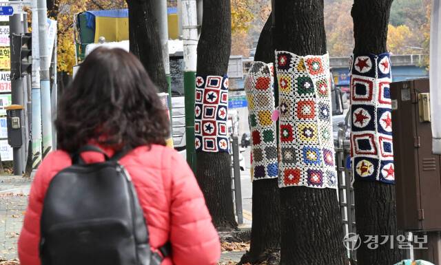 쌀쌀한 날씨를 보인 17일 인천 남동구 만성중학교 일대 가로수에 중학교 학부모들이 만든 형형색색의 손뜨개 옷이 입혀져 있다.