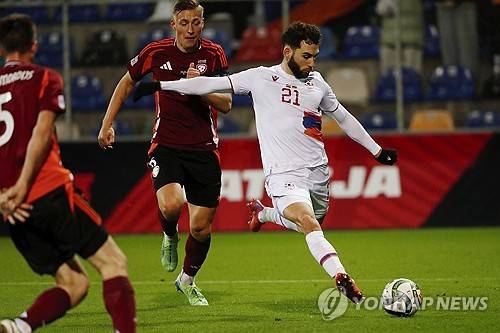 epa11725913 Kristers Tobers of Latvia in action against Nayair Tiknizyan of Armenia (R) during the UEFA Nations League match between Latvia and Armenia in Riga, Latvia, 17 November 2024. EPA/TOMS KALNINS