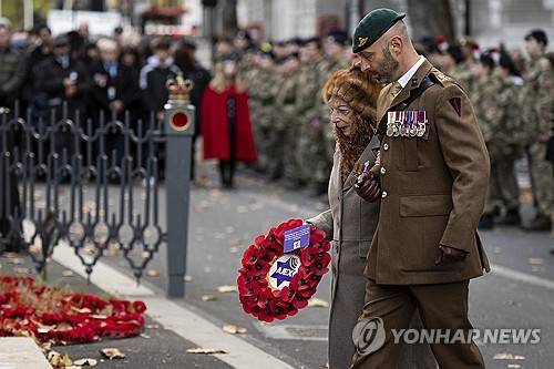 Henny Franks, 101, left, a Kindertransport survivor lays a wreath during the annual parade by AJEX, the Jewish Military Association, to honour and remember the service of Jewish servicemen and women 'who fought and served for freedom since World War I' at the Cenotaph, Whitehall, in London, Sunday, Nov. 17, 2024. (Aaron Chown/PA via AP) UNITED KINGDOM OUT; NO SALES; NO ARCHIVE; PHOTOGRAPH MAY NOT BE STORED OR USED FOR MORE THAN 14 DAYS AFTER THE DAY OF TRANSMISSION; MANDATORY CREDIT