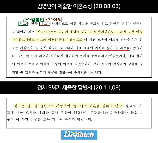 "김병만을 진심으로 사랑하여 이혼을 원하지 않습니다. 대화를 통해 원만히 해결해 부부관계를 회복하고자 하니, 부디 이 사건 청구를 모두 기각해 주시길 바랍니다." (2020.11.9, S씨 답변서)