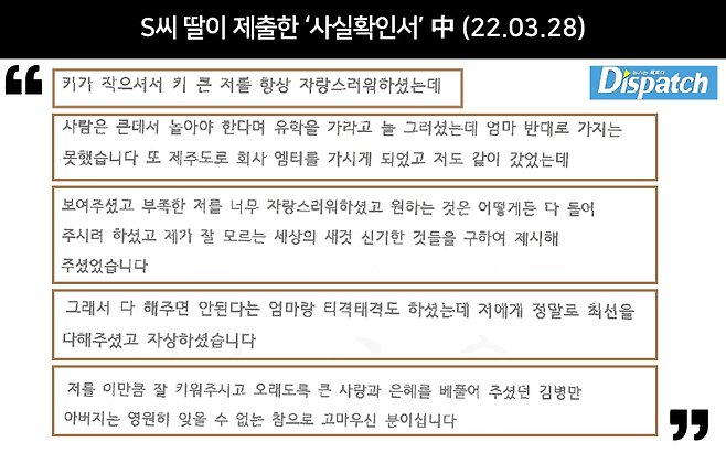 "그분은 제게 정말로 최선을 다해주셨습니다. 저를 이만큼 잘 키워주시고 오래도록 큰 사랑과 은혜를 베풀어 주셨습니다. 김병만 아버지는 참으로 고마우신 분이십니다." (사실확인서, 2022. 3. 28)