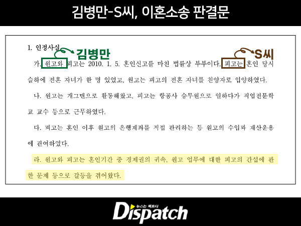 '디스패치'가 김병만과 S씨의 이혼 전말을 파악했다. 김병만이 이혼을 결심한 배경과 법원의 판단 등을 소장 및 판결문을 통해 확인했다. 사랑으로 시작했을까? 결론은, 돈돈돈이었다.