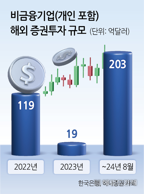 18일 한국은행 경제통계시스템 및 하나증권에 따르면, 올 1~8월까지 개인투자자가 속하는 비금융기업의 증권투자 비중은 전체의 33.6%(203억달러)를 기록한 것으로 집계됐다. 이는 관련 통계를 집계한 이후 역대 최대치다. 금융기관을 제외한 투자 주체인 비금융기업은 주로 개인으로 구성됐다는 게 한은의 설명이다. 2019년엔 6.8%에 그쳤지만 코로나 팬데믹을 거치면서 ▷2020년(32.2%) ▷2021년(26%) ▷2022년(26.1%) 순으로 커졌다.