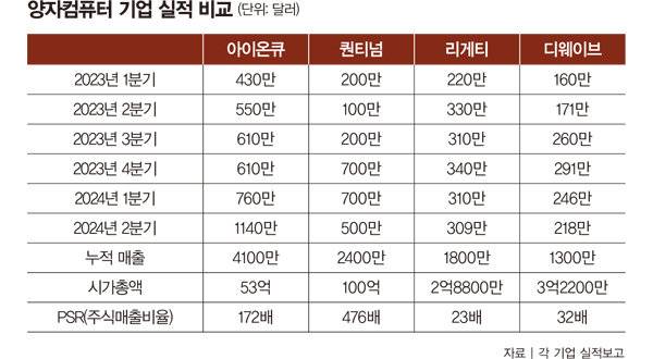 "현재 양자 기업 가운데 매출을 공개한 기업은 아이온큐 퀀티넘, 리게티, 디웨이브 4개 기업밖에 없다(표 참조). 그 가운데 아이온큐 누적 매출이 4100만 달러(약 576억1300만 원)로 압도적이다. 매출도 매년 100%씩 성장 중이다. 또한 아이온큐는 미국 시애틀에 양자컴퓨터 제조 공장을 세우는 등 자신감 있는 행보를 보이고 있다. 최근에는 양자네트워킹 분야로까지 사업을 넓히며 시장을 주도하고 있다. 아이온큐가 다른 기업들과 비교해 뛰어난 실적을 내고 있어 집중 투자하고 있다."
