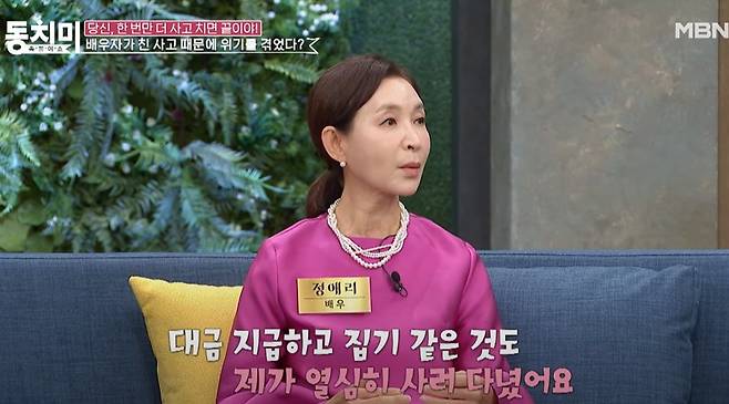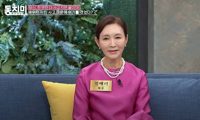 지난16일 방송된 MBN 예능 '속풀이쇼 동치미'에서는 정애리가 '당신, 한 번만 더 사고 치면 끝이야'라는 주제로 이야기를 나눴다.