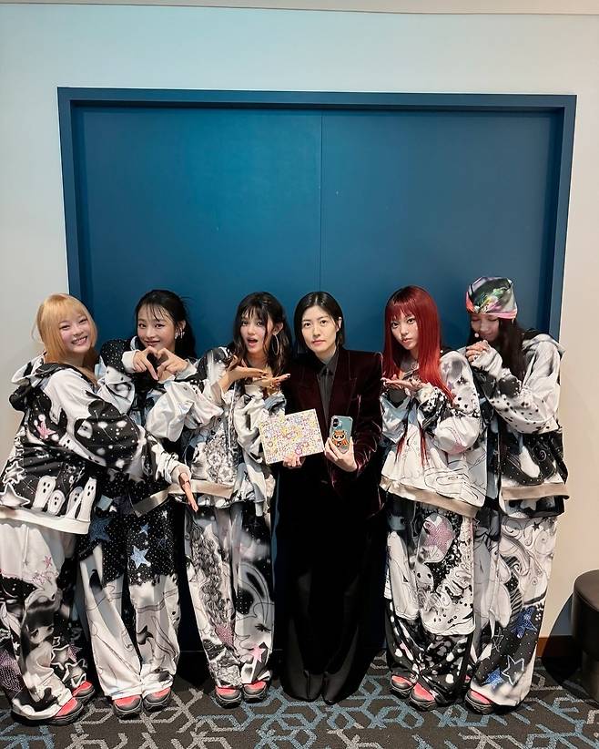 공개된 사진 속 심은경은 뉴진스 멤버들과 함께 대기실에서 인증샷을 찍는 모습이다.