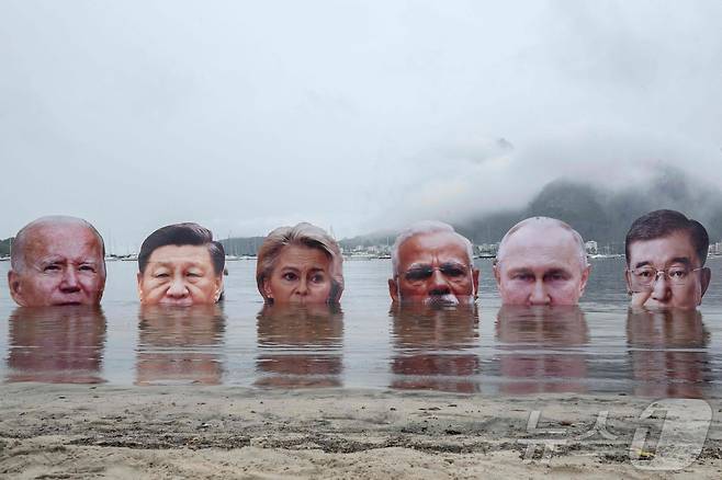 (리우데자네이루 AFP=뉴스1) 우동명 기자 = 16일(현지시간) G20 정상회의가 열리는 브라질 리우데자네이루에서 기후변화와 생물 다양성 위기에 항의하는 원주민들이 조 바이든 미국 대통령, 시진핑 중국 주석, 우르줄라 폰데어라이엔 EU 집행위원장, 나렌드라 모디 인도 총리, 블라디미르 푸틴 러시아 대통령, 이시바 시게루 일본 총리의 거대한 초상화를 물에 잠기게 설치해 놓고 있다. 2024,11,18