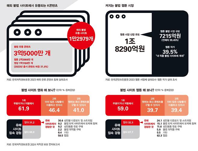 한국저작권보호원(저작권보호원)이 2023년 8월25일~10월18일까지 해외 불법 유통 사이트에서 유통된 한류 콘텐츠 실태를 조사한 결과 웹툰이 2억3900만 개, 영화·방송 등 영상 콘텐츠가 1억1100만 개 유통되고 있는 것으로 나타났다. 전체 불법 유통량 중 2023년 방영·개봉·연재된 콘텐츠가 30% 이상이었다. 최신 콘텐츠의 불법 유통은 K콘텐츠 산업에도 악영향을 끼친다. 콘텐츠 매출뿐 아니라 수출로도 이어지는 문제이기 때문이다. 산업은 부흥하고 있지만, 2023년 연간 콘텐츠 산업 매출은 151조585억원으로 전년 대비 0.01% 감소했다. 콘텐츠 산업 수출액 역시 129억6295만 달러로 전년보다 2.1% 줄어들었다.