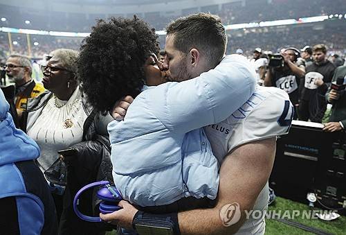 Toronto Argonauts quarterback Nick Arbuckle kisses his wife Zakiyyah Arbuckle after defeating the Winnipeg Blue Bombers in a CFL football game at the 111th Grey Cup in Vancouver, British Columbia, Sunday, Nov. 17, 2024. (Darryl Dyck/The Canadian Press via AP) MANDATORY CREDIT