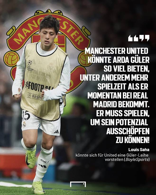 레알 마드리드 미드필더 아르다 귈레르(19·튀르키예)가 정규적인 출전시간을 보장받지 못하면서 성장세가 멈춘 가운데, 이런 그를 향해 레전드 루이 사아(46·프랑스)가 맨체스터 유나이티드행을 적극 추천했다.