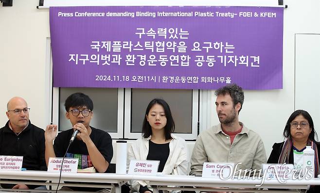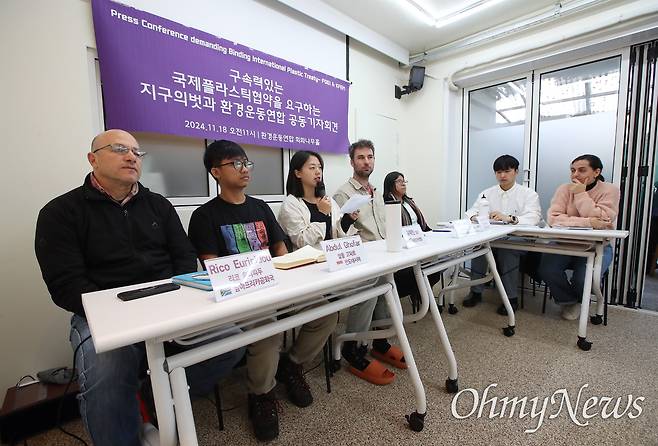 | ▲ 남아프리카공화국 지구의벗, 인도네시아 지구의벗, 엘사바도르 지구의벗, 호주 지구의벗, 환경운동연합 등 참석자들이 "플라스틱 생산, 소비, 무역을 줄이고 체계전환을 위한 해법을 확대하여 플라스틱 오염을 종식하기 위한 강력한 국제플라스틱협약이 마련되기를 촉구"하는 요구서를 발표하고 있다. |