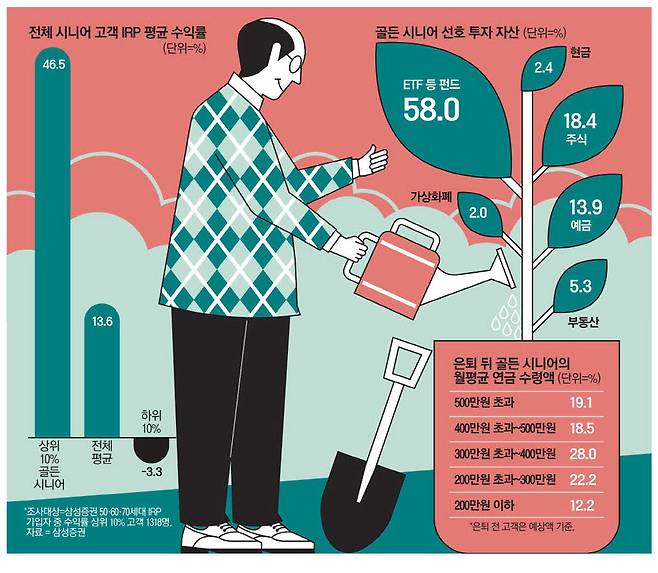 자산운용 업계에서는 어떤 포트폴리오를 구성하느냐에 따라 향후 연금 수령액이 크게 달라질 수 있다고 조언한다. 삼성증권 IRP 수익률 상위 10% 시니어 고객의 평균 수익률은 46.5%에 달하는 반면, 수익률 하위 10% 고객의 평균 수익률은 -3.3%로 손실권이었다. 전체 고객의 평균 수익률은 13.6%다.