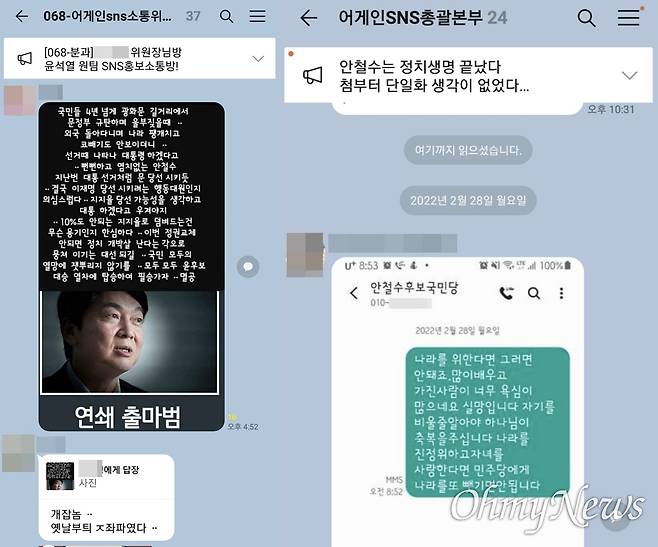 | ▲ 지난 대선 중 국민의힘 차원에서 운영했던 '어게인SNS소통위원회' 채팅방 중 68번방에 안철수 국민의당 후보를 "연쇄 출마범", "개잡놈", "좌파" 등으로 비방하고 있는 게시글(왼쪽). 또한 윤석열 후보가 포함된 '20번방'의 전신인 '총괄본부방'에 올라온 안 후보에게 보낸 문자메시지 인증 이미지. 당시 안 후보는 단일화 과정에서 윤 후보 지지자들로부터 수 만 건의 '문자 폭탄'이 쏟아지고 있다고 밝힌 바 있다. |