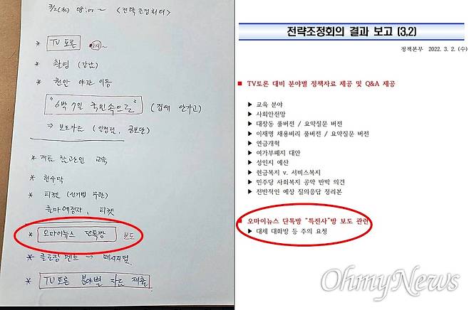 | ▲ 지난 대선에서 윤석열 국민의힘 후보 캠프의 정책총괄지원실장을 맡았던 신용한 전 서원대 석좌교수의 문건. 왼쪽은 신 전 교수가 2022년 3월 2일 캠프 전략조정회의 내용을 수기로 작성한 것이고, 오른쪽은 이를 토대로 정리한 전자 문서다. 문건에는 당시 <오마이뉴스>의 보도에 대한 내용이 담겨 있다(붉은색 원). |