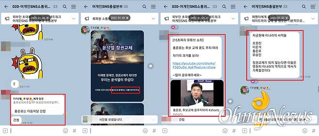 | ▲ 지난 대선 중 국민의힘 차원에서 운영했던 '어게인SNS소통위원회' 카카오톡 채팅방 중 윤석열 후보도 포함돼 있는 '20번방'과 그 전신인 '총괄본부방'에 올라온 홍준표 의원 관련 비방 글. |