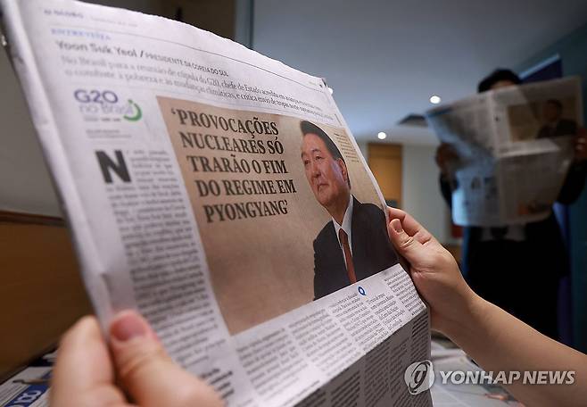(리우데자네이루=연합뉴스) 홍해인 기자 = 대통령실은 17일(현지시간) 주요 20개국(G20) 정상회의 참석을 위해 브라질을 방문 중인 윤석열 대통령이 브라질 일간지 <우 글로부>, <폴랴 지 상파울루>와 서면 인터뷰를 갖고 미국 신행정부 출범으로 심화 가능성이 점쳐지는 미-중 간 전략경쟁에 대한 해법을 내놓았다고 밝혔다.