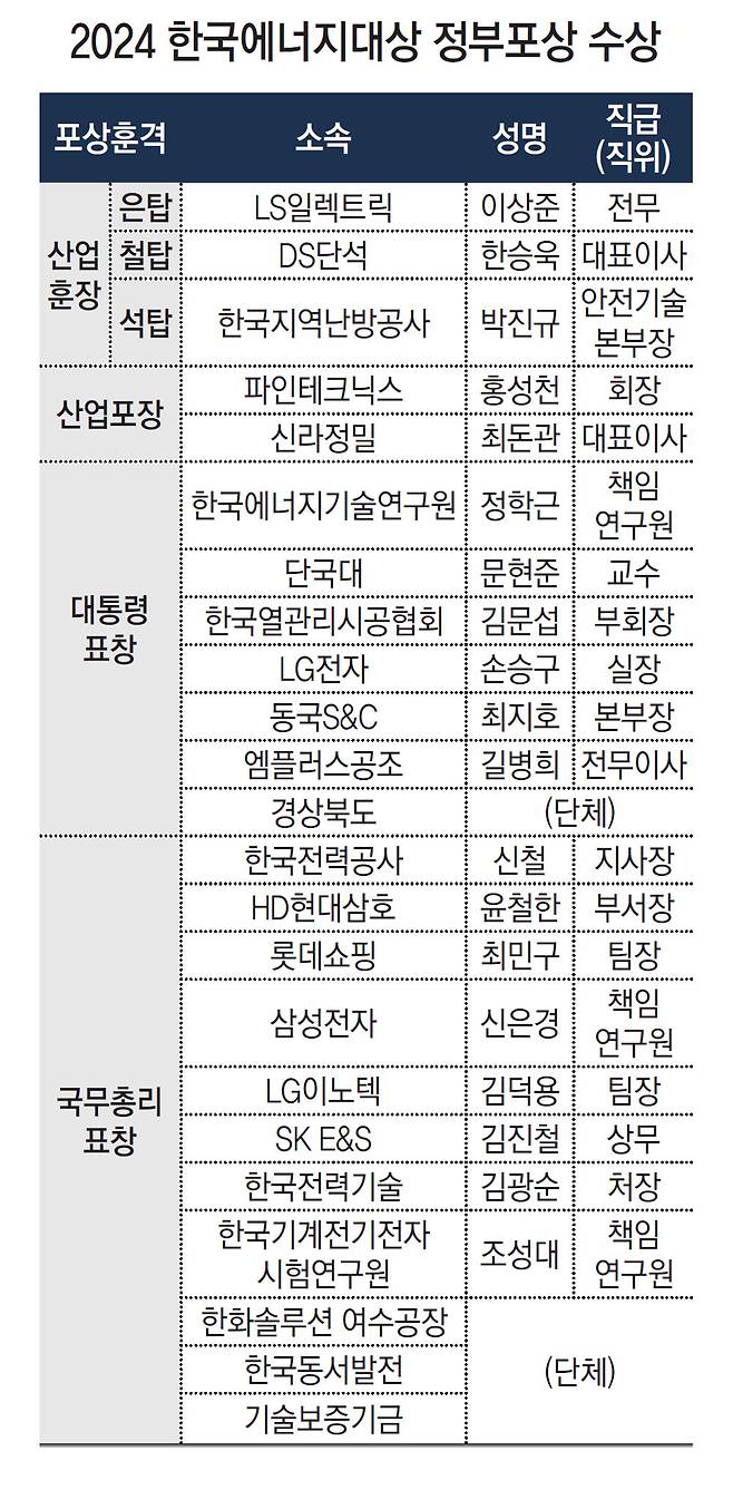 산업통상자원부가 주관하고 한국에너지공단이 주최하는 '2024 한국에너지대상' 시상식에서 LS일렉트릭 이상준 전무, DS단석 한승욱 대표이사, 한국지역난방공사 박진규 안전기술본부장이 산업훈장을 받았다.