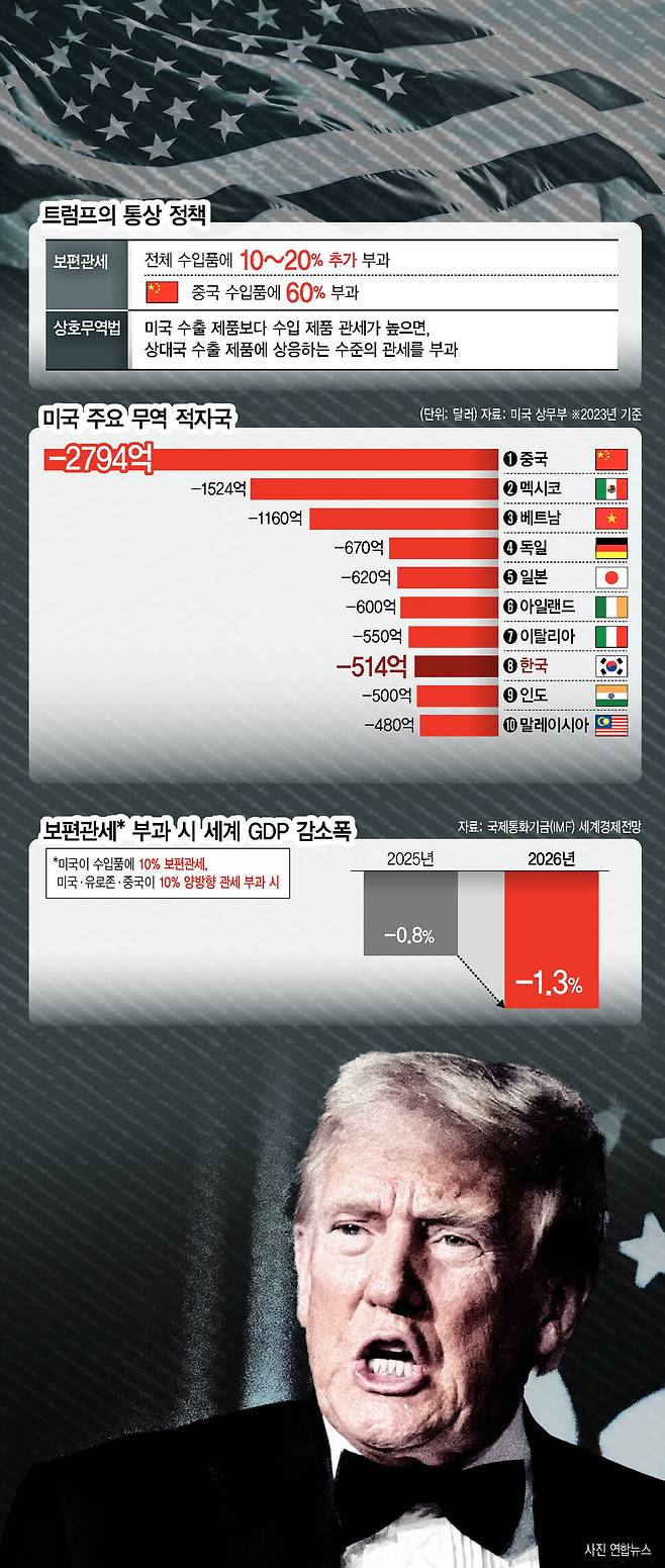 관세 장벽을 앞세운 보호무역주의 강화가 세계의 경제성장에 걸림돌이 될 것이라는 우려가 나온다. 국제통화기금(IMF)은 지난달 22일 공개한 세계경제전망 보고서에서 미국과 중국, 유로존(유로화를 쓰는 유럽 20개 나라)이 수입품에 10% 관세 인상을 도입하면 세계 경제성장률이 2025년 0.8%, 2026년에는 1.3% 감소할 것이라고 밝혔다. 내년 미국 성장률은 1%가량 내려갈 것으로 예상했다.