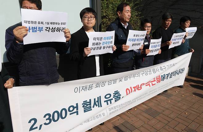 | ▲ 경제정의실천시민연합과 참여연대 등 시민사회단체가 지난 11일 이재용 삼성전자 회장의 '부당합병·회계부정' 혐의 사건 항소심이 열리는 서울고등법원 앞에서 처벌 촉구 기자회견을 하고 있다. |