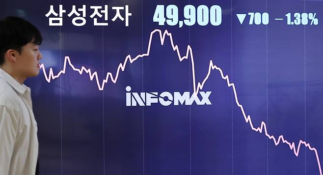 | ▲ 지난 14일 오후 서울 종로구 연합인포맥스 모니터에 삼성전자 주가가 표시돼 있다. 이날 삼성전자는 전날보다 1.38% 내린 4만9천900원으로 장을 마감했다. 이는 지난 2020년 6월 15일 종가 4만9천900원을 기록한 후 4년5개월 만에 최저가다. |