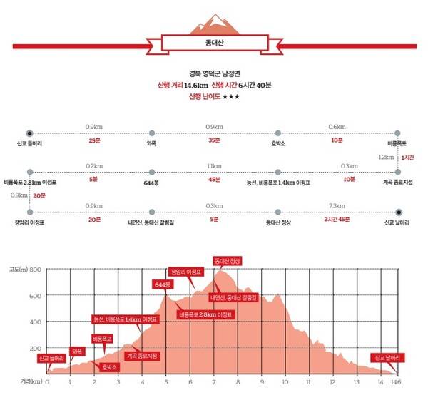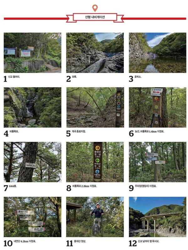 동대산 정상에서 비룡폭포 1.4km 삼거리 이정표까지는 1시간 15분 걸린다. 여기서 비룡폭포를 향해 경방골로 하산하는데 비룡폭포까지 40분, 비룡폭포에서 신교 들머리까지는 50분이 소요된다. 신교 입구 들머리에서 시작해 동대산 정상을 밟고 다시 신교 입구로 되돌아오는 산행은 총 14.6km의 거리에 6시간 40분이 소요된다.