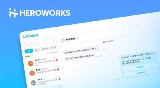 히어로웍스의 'AI 챗봇'은 기존 챗봇 서비스에 AI 기능을 추가해 정해진 질문 외에도 다양한 문의에 자동 응답하며, 다국어 지원 기능을 통해 모든 고객이 모국어로 소통할 수 있어 언어 장벽을 해결할 수 있는 것이 특징이다.