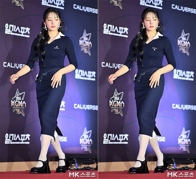 이날 레드카펫에서 민지는 지퍼기 오픈된 스커트 패션으로 포토월 무대에 올라 취재진의 플래시 세례를 받았습니다.