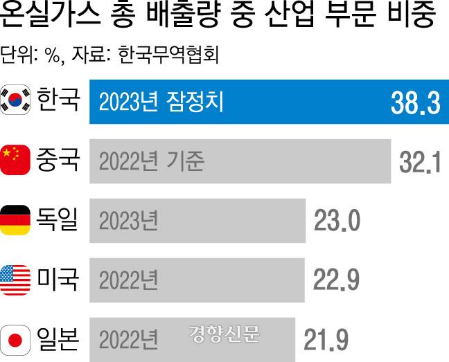 중국의 산업 분야 온실가스 배출량은 50억3140만t(2022년 기준)으로 전체의 32.1%였다. 한국과 유사하게 국내총생산(GDP)에서 제조업 비중이 큰 미국·일본·독일 모두 산업 분야 온실가스 배출량은 전체의 30%를 밑돌았다. 이들 3개국의 산업 분야 온실가스 배출량 비중은 독일(23.0%)·미국(22.9%)·일본(21.9%) 순이었다.