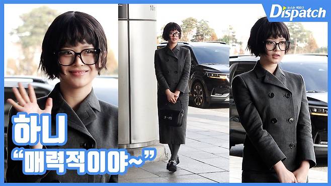 이날 하니는 그레이 색상의 정장 셋업에 로퍼, 안경을 매치하면서 더욱 고급스러운 매력을 뽐냈다.