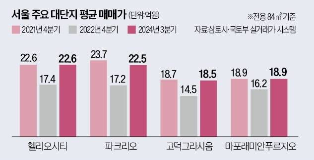 올해 3분기 평균 매매값이 2021년 4분기 고점 수준까지 올라온 대단지는 '리센츠·트리지움·헬리오시티'(송파구)와 '마포래미안푸르지오'(마포구) 등으로 조사됐다.