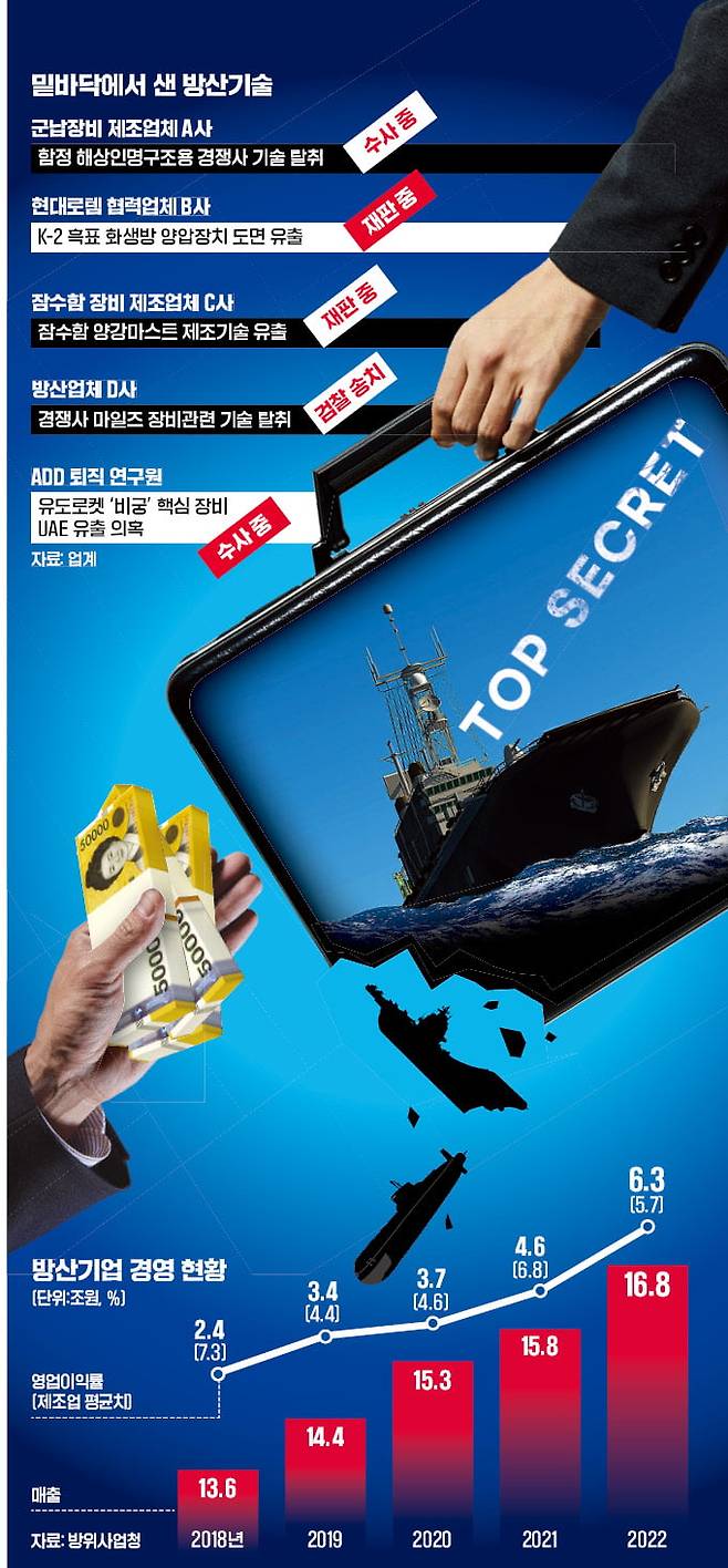 19일 수사당국과 방산업계에 따르면 T사는 2022년께 도산할 위기에 놓인 중소기업 K사의 임원을 꾀어 100GB(기가바이트) 분량의 기밀을 빼냈다. 훔친 기술을 토대로 해군군수사령부, 국내 방산 대기업 등에 제품을 공급한 것으로 확인됐다. 건당 수십억원 규모로 총 수백억원대 매출을 올렸다.
