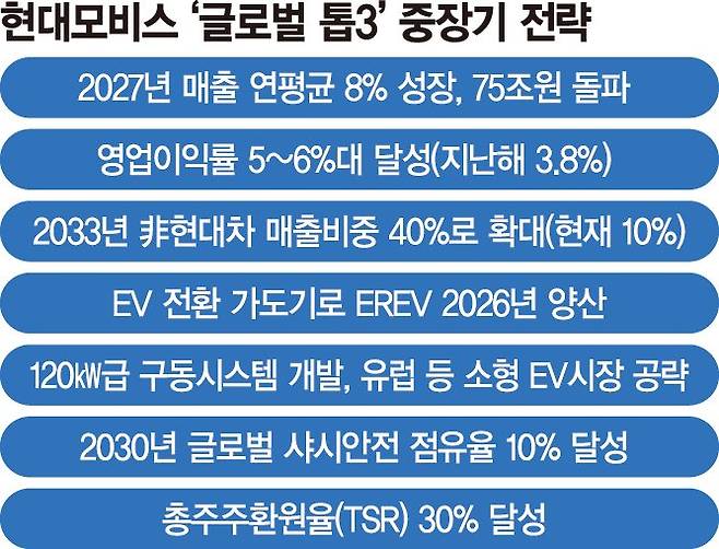 현대모비스는 2027년까지 향후 3년간 매출을 연평균 8%대로 확대하는 등 자동차 부품업계 '글로벌 톱3'전략을 단계적으로 가동한다.