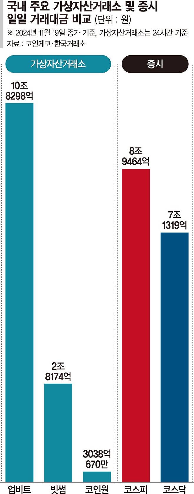 미국 대선 이후 국내 가상자산거래소들의 하루 총거래대금(24시간 기준)이 연일 15조~20조원에 달하는 것도 이를 방증한다. 이는 코스피·코스닥 일일 거래대금 합산(약 16조~18조원)과 맞먹는 규모다. 그럼에도 더불어민주당은 1400만 주식투자자를 위한 금융투자소득세 폐지는 찬성하고, 2000만 가상자산투자자를 위한 가상자산 과세 유예는 반대하고 있는 실정이다.