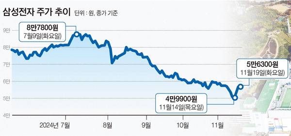 그러나 그때가 정점이었다. 8월 들어 다시 7만 원대를 기록하던 주가가 지난 9월 5일에는 종가 6만9000원으로 떨어졌고, 10월 10일에는 5만 원대까지 하락했다. 11월 초에는 도널드 트럼프 미국 대통령 당선 여파까지 더해지며 지난 14일 종가는 4만9900원으로 떨어졌다. 코로나19 공포가 극에 달했던 2020년 6월 이후 약 4년 반 만에 최저가다. 대장주 삼성전자 주가에 따라 국내 증권 시장 전체가 요동쳤다.
