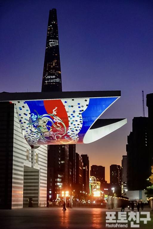 해가 진 후 하늘이 파랗게 변하는 블루아워에 롯데타워의 조명이 켜집니다.