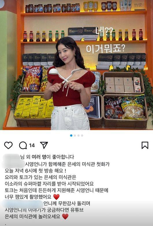공개된 게시물에는 “시영언니가 함께해준 ‘은세의 미식관’ 첫 화가 오늘 저녁 6시에 첫방송해요!”라며 “요리와 토크가 있는 은세의 미식관은 이소라의 슈퍼마켙 자리를 받아 시작되었어요”라며 “토크는 처음인데 든든하게 지원해준 시영언니 때문에 너무 잼있게 촬영했어요”라는 글이 담겨 있었다.