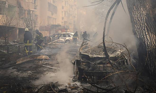 | 폐허로 변한 도시 러시아가 우크라이나를 침공한 지 19일(현지시간)로 1000일이 된 가운데 18일 우크라이나 오데사의 소방대원 등이 러시아의 로켓공격으로 타버린 건물과 차량에서 발생한 화재를 진압하고 있다. 오데사=AP연합뉴스 |