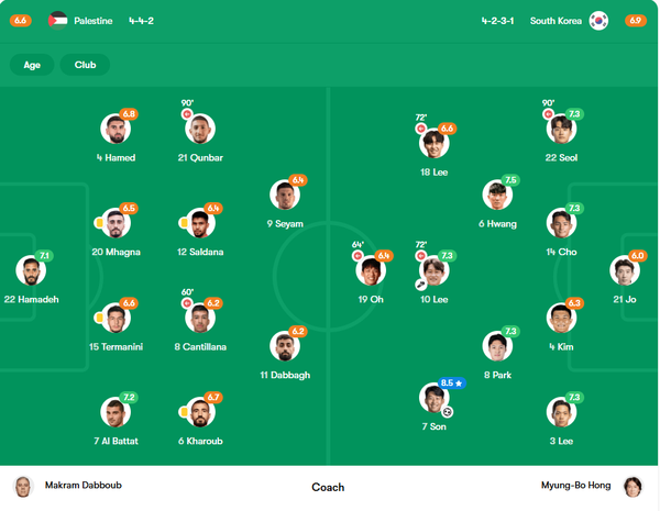 역사적인 A매치 51호골을 기록하며 ‘전설’ 황선홍의 기록을 넘어선 손흥민이 팔레스타인전 최우수선수(MOM)와 최고 평점을 받았다. 최하 평점은 실점을 허용한 조현우였다.