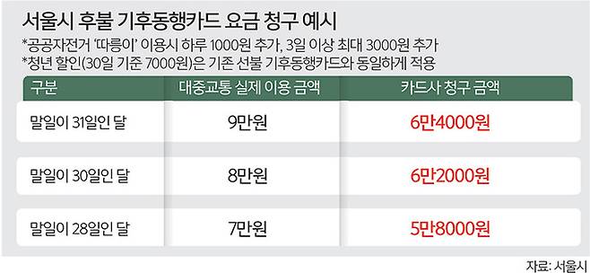 후불 기후동행카드는 매달 1일부터 말일까지 정액으로 지하철과 버스 등 대중교통을 횟수 제한 없이 이용할 수 있다. 말일이 30일인 달은 시 공공자전거 ‘따릉이’ 이용을 하지 않는 기후동행카드 월(30일 기준) 정기권 가격인 6만2000원, 28일인 달은 5만8000원, 31일인 달은 6만4000원이다. 대중교통 이용 금액이 정액보다 적을 경우엔 일반 교통카드처럼 실제 이용 금액만 청구되는 것이 특징이다.