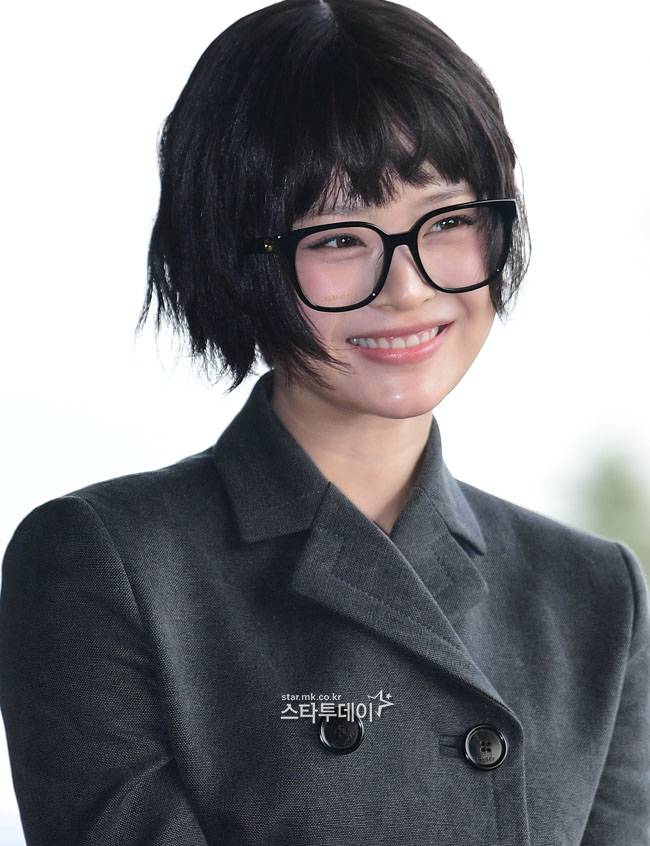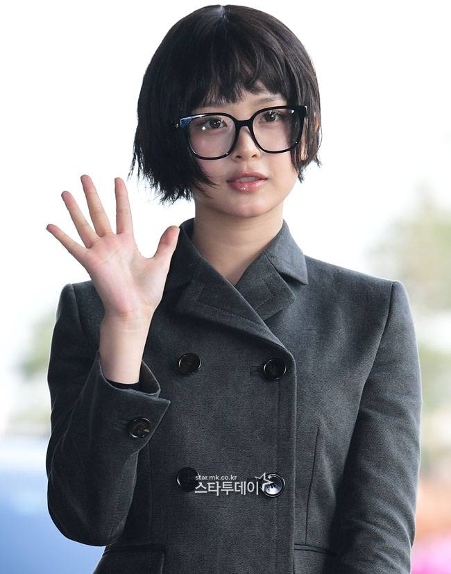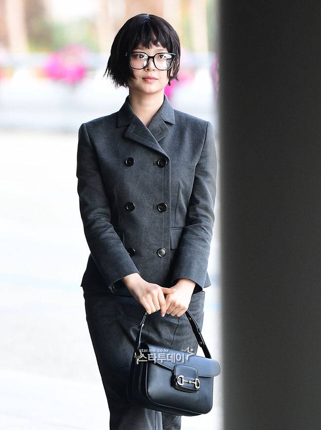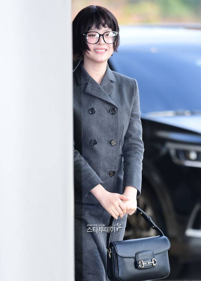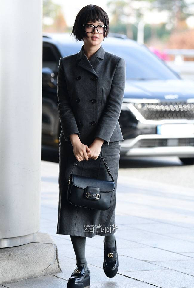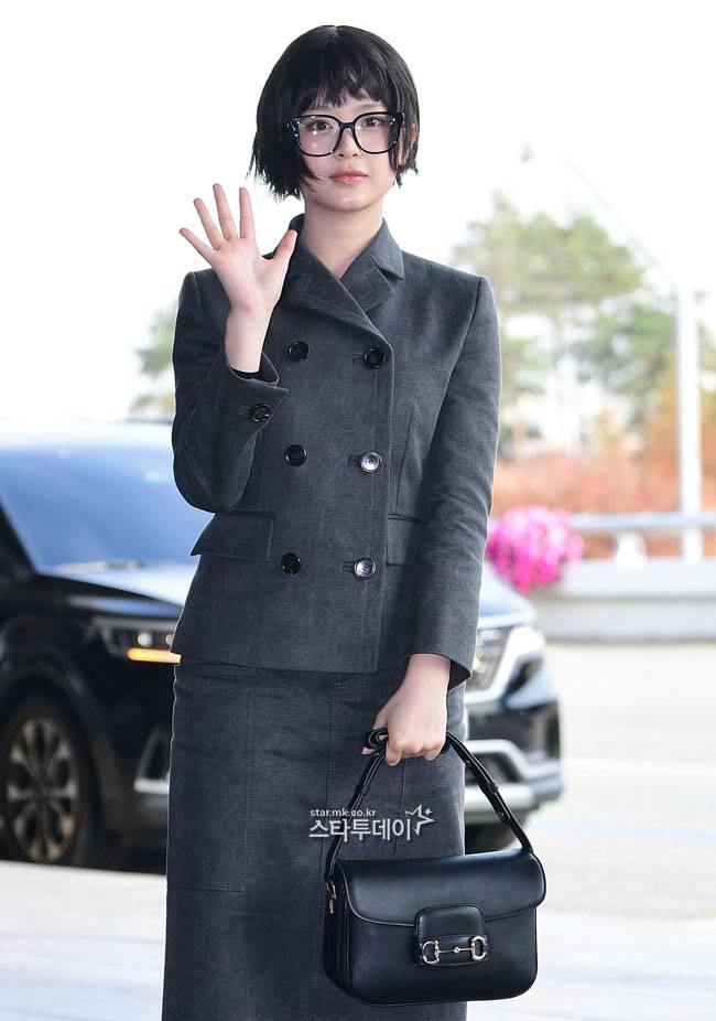 밝은 모습으로 공항에 도착한 하니는 그레이톤의 치마와 재킷 셋업에 블랙 로퍼, 안경을 매치해 심플하면서도 세련된 공항패션을 완성했다.