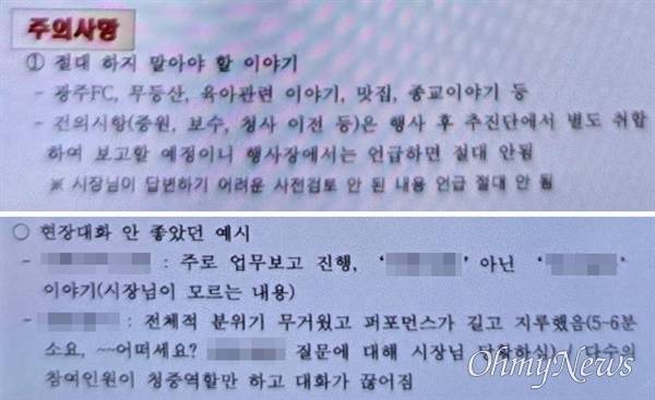 시는 한 공공기관 간담회에 앞서 광주FC, 무등산, 육아 관련 이야기를 '절대 하지 말아야 할 이야기'라고 주의를 시킨 것으로 확인됐다.