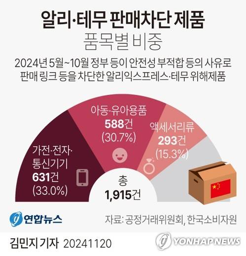 (서울=연합뉴스) 김민지 기자 = 20일 공정거래위원회와 한국소비자원에 따르면 정부는 지난 5월부터 지난달까지 1천915건의 알리익스프레스·테무 위해제품 판매 및 재판매 링크와 페이지를 차단했다.