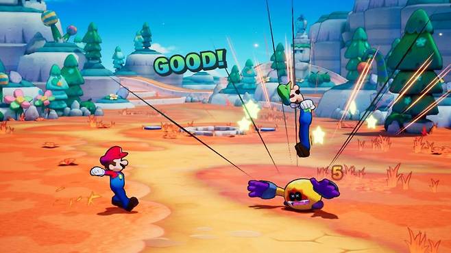 전투도 마찬가지다. 기본적인 공격인 점프와 해머 역시 형제가 협력해야 최대 효율을 낼 수 있으며, 공격 타이밍에 맞춰 버튼을 눌러야 추가 대미지를 줄 수 있다. 아울러 스토리를 진행하거나 퀘스트를 완료하면 얻을 수 있는 일종의 스킬인 ‘브라더 어택’을 통해 강한 협력기를 발동하는 등 두 캐릭터의 협력 요소를 통해 전투의 재미를 한층 끌어올렸다.