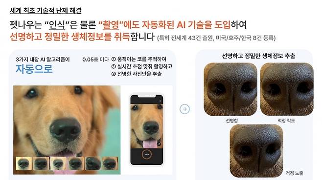 반려동물이 수시로 움직이기 때문에 선명한 생체사진을 찍기 어렵다는 점이 반려동물 생체인식 상용화의 가장 큰 걸림돌이었으나, 펫나우는 개 비문(코 무늬)과 고양이 얼굴을 ‘찍는 단계’에 세계 최초로 인공지능을 도입해 문제를 해결했다. AI가 강아지의 코와 고양이의 얼굴을 빠르게 찾고, 자동으로 초점을 맞추어 고속으로 찍고, 선명한 사진만을 선별한다. 따라서 사용자는 셔터를 누를 필요 없이 스마트폰 카메라를 반려동물의 얼굴로 향하고 있기만 하면 생체정보 등록이 빠르게 완료된다.